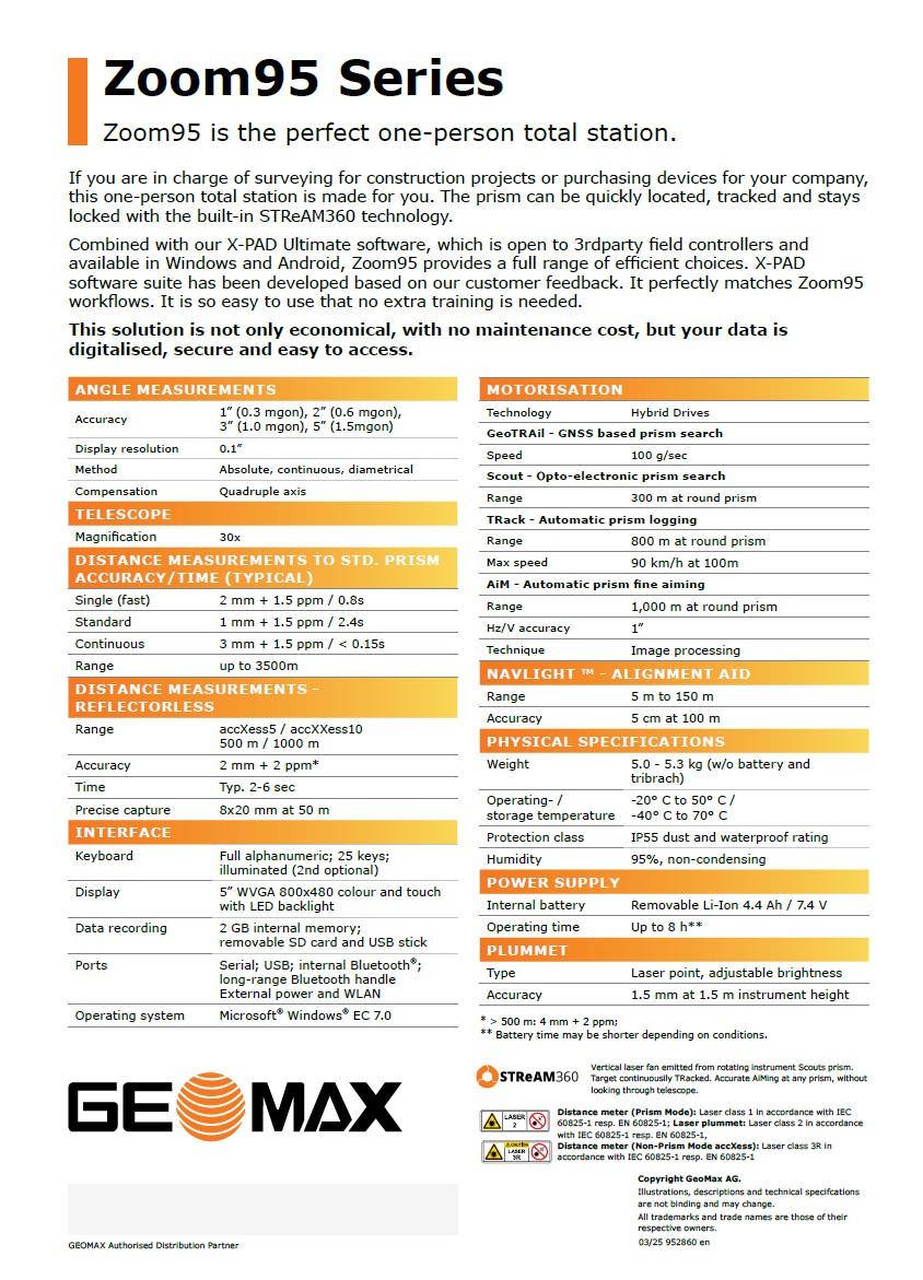 The GeoMax Zoom95 Total Station is a high-performance robotic total station built for demanding construction and surveying projects. Designed for true one-person operation, it combines long-range reflectorless measurement, fast and reliable prism tracking, and seamless connectivity to keep your fieldwork efficient from start to finish. With its built-in STReAM360 technology and intuitive X-PAD software, the Zoom95 locks on targets quickly, tracks consistently in tough conditions, and transfers data smoothly from site to office.