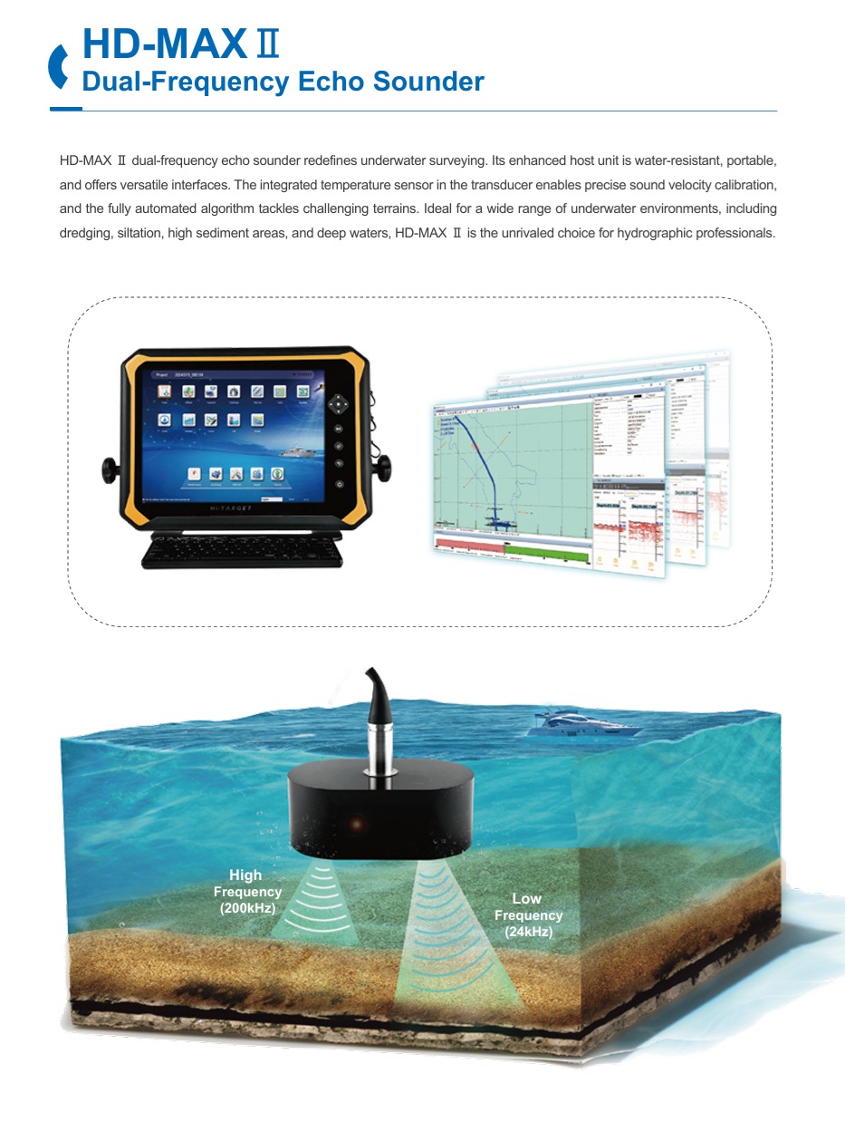 Available exclusively in the Philippines through RASA Surveying Instruments, the Hi-Target HD MAX 2 is a professional-grade, dual-frequency echosounder engineered for highly accurate hydrographic and bathymetric surveys. By utilizing both high and low frequencies in a single rugged unit, it effectively handles shallow, intermediate, and deep-water mapping, eliminating the need for multiple single-frequency devices. The system is built for harsh field conditions and integrates seamlessly with various GNSS systems and third-party sensors for a complete hydrographic solution.